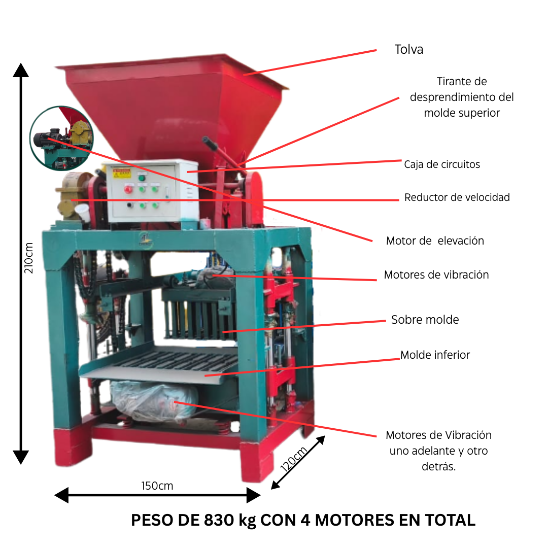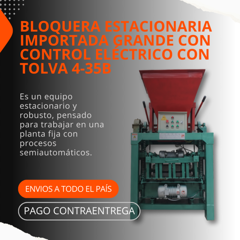 Es una máquina semiautomática diseñada para la fabricación eficiente de bloques de hormigón, ladrillos y adoquines. Incorpora control eléctrico que automatiza los ciclos de vibración y compresión, logrando bloques densos y uniformes, ideal para pequeñas y medianas producciones.