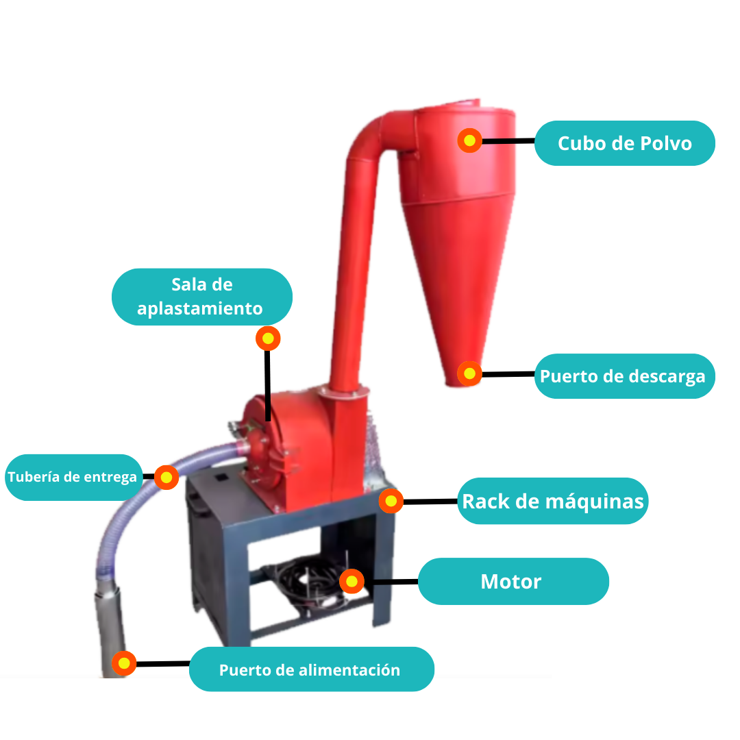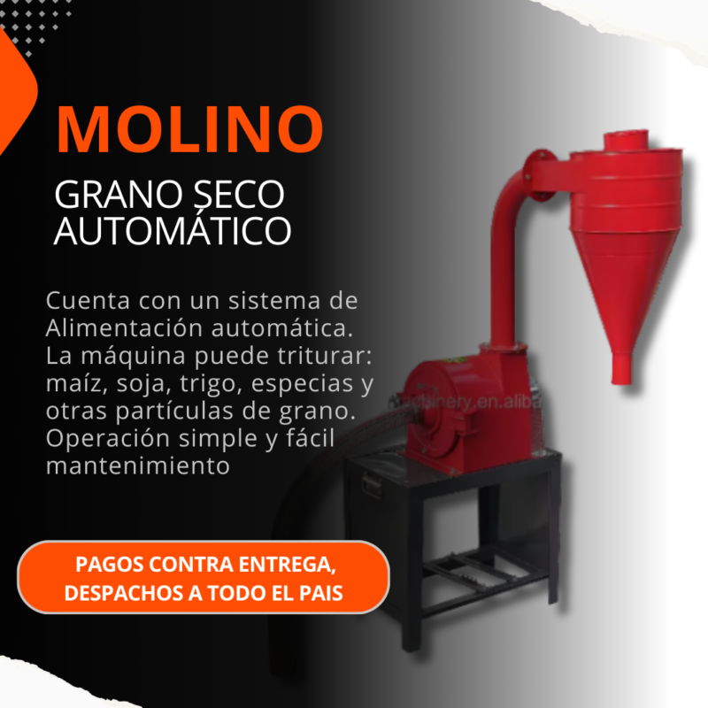 Equipo agrícola diseñado para la trituración eficiente de granos secos, incorporando un sistema de alimentación automática que permite un flujo continuo de trabajo, mayor productividad y menor esfuerzo operativo. Es ideal para procesar maíz, soja, trigo, especias y otros granos o partículas secas, obteniendo una molienda uniforme adecuada para la preparación de alimentos balanceados, concentrados o insumos agrícolas