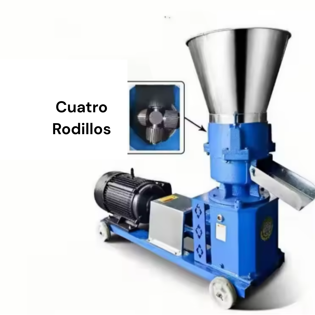 Diseñada para la producción intensiva de pellets de alta calidad para alimentación animal y aprovechamiento de biomasa. Su potente sistema de 4 rodillos de presión y 4 discos de granulación garantiza un prensado uniforme, mayor densidad del pellet y un rendimiento constante en jornadas prolongadas.