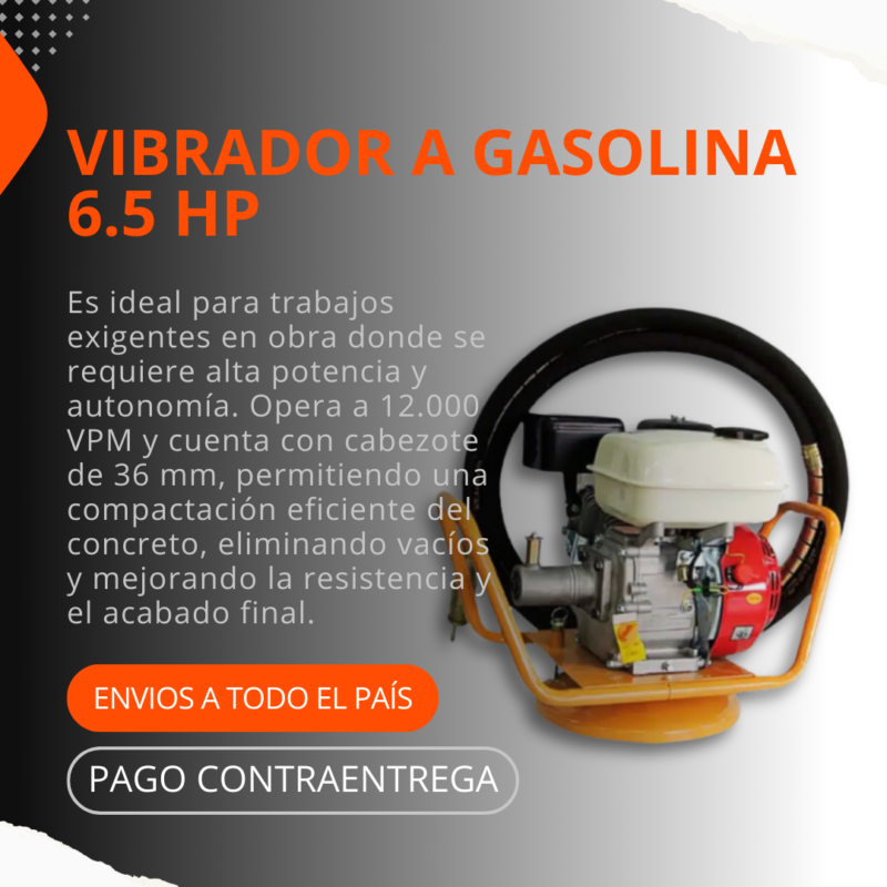 El Vibrador de Concreto a Gasolina 6.5 HP ofrece potencia y autonomía para un desempeño superior en obras exigentes. Funciona a 12.000 RPM e incorpora cabezote de 36 mm, logrando una compactación uniforme del concreto, reduciendo vacíos y optimizando la resistencia y el acabado final. Su diseño robusto y rendimiento constante lo hacen ideal para uso profesional continuo.